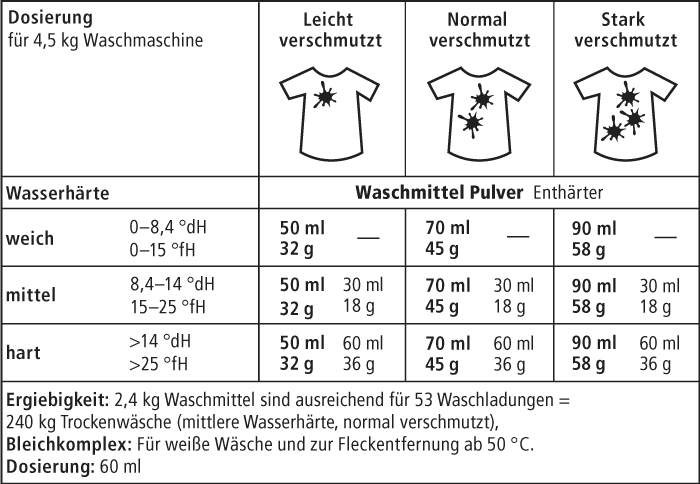 Ist eine optimale Nutzung der einzelnen Stoffe entsprechend dem Verschmutzungsgrad der Kleidung, der Härte des Wassers und dem ganz individuellen Bedürfnis nach dem Weißgrad der Wäsche wirklich möglich. Für ein Seifenwaschmittel ist weiches Wasser unbedingte Voraussetzung. Durch das Baukastenprinzip ist somit die Grundlage geschaffen, die unübertroffenen Vorteile der Seife auch bei härterem Wasser nutzen zu können.